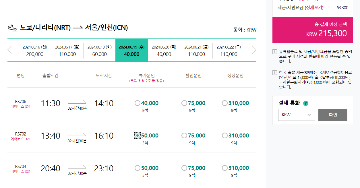 출발시간과 도착시간을 확인해 특가/할인/정상운임의 잔여좌석이 있는 곳을 선택하면 됩니다. 왕복 항공권 운임과 유류할증료, 세금(국제여객공항 이용료, 출국납부금, 국제빈곤퇴치기여금)이 포함된 최종 금액을 확인할 수 있습니다.