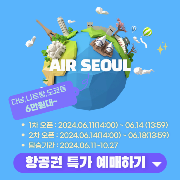 에어서울은 6월 11일부터 10월 27일까지 탑승할 수 있는 다낭, 나트랑, 도쿄, 후쿠오카 등 동남아 항공권을 최대 97% 할인하는 프로모션 행사를 진행하고 있습니다. 특가 항공권은 바로 매진될 수 있어서 행사가 오픈되면 서둘러 예매하시기 바랍니다.