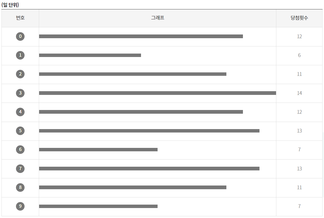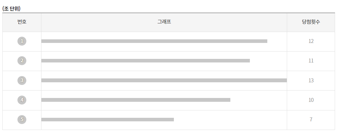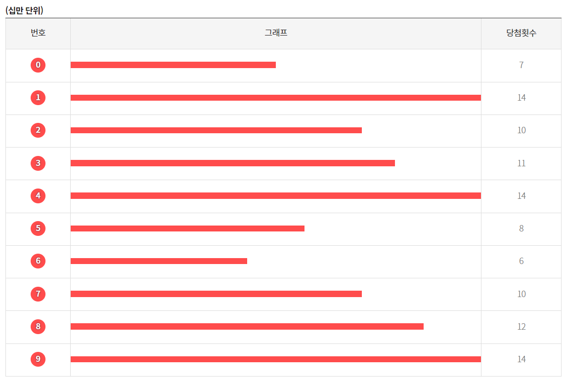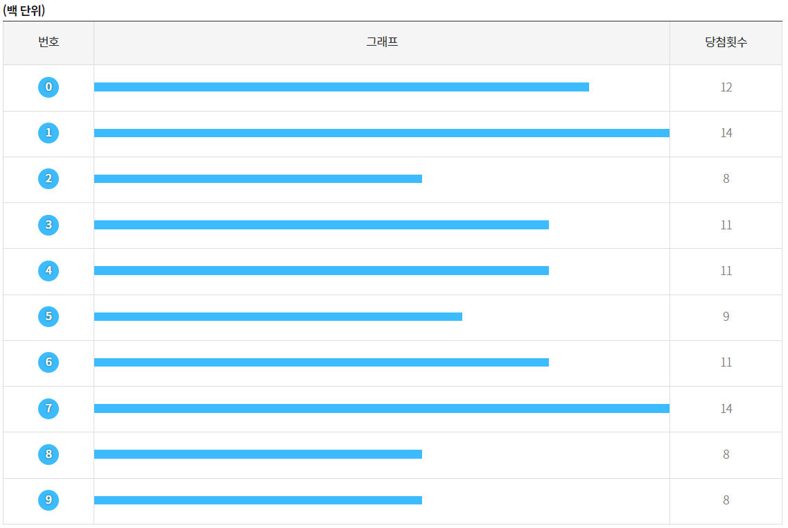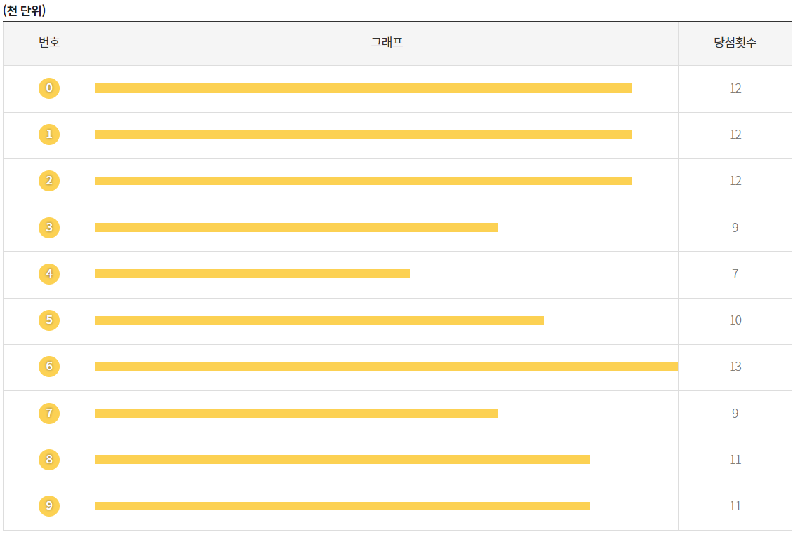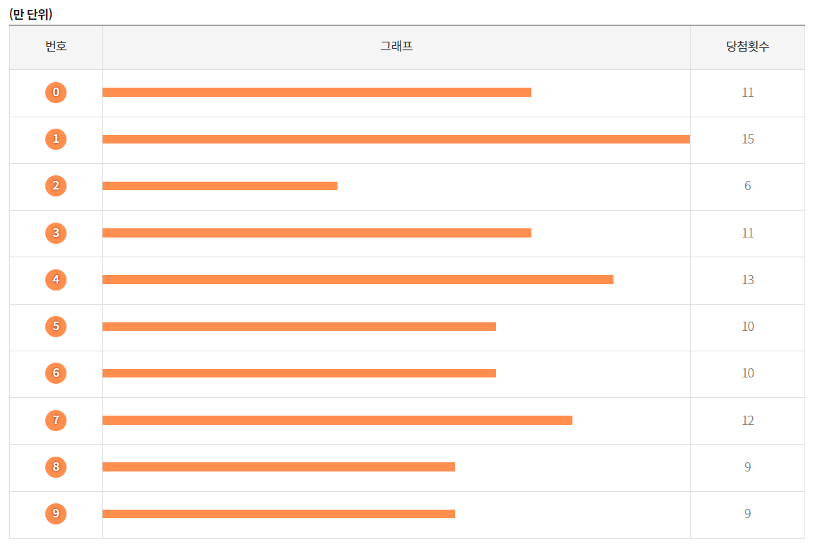 최근 1년간 연금복권 720 의 1등과 보너스 번호 당첨 통계입니다. 조단위, 십만, 만, 천, 백, 십, 일단위에서 가장 당첨이 많이 된 번호입니다. (통계기간 : 163회차 ~ 215회차)